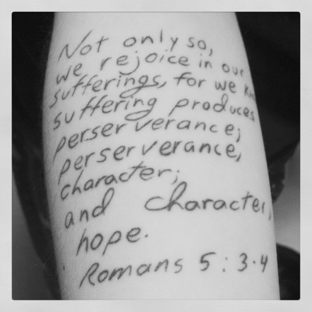 I will end with one photo. It is a photo of my daughter’s arm. Her tattoo was done in my handwriting at her request. Romans 5:3 holds a lot of meaning for both of us on several different levels. It is a verse that we live by.